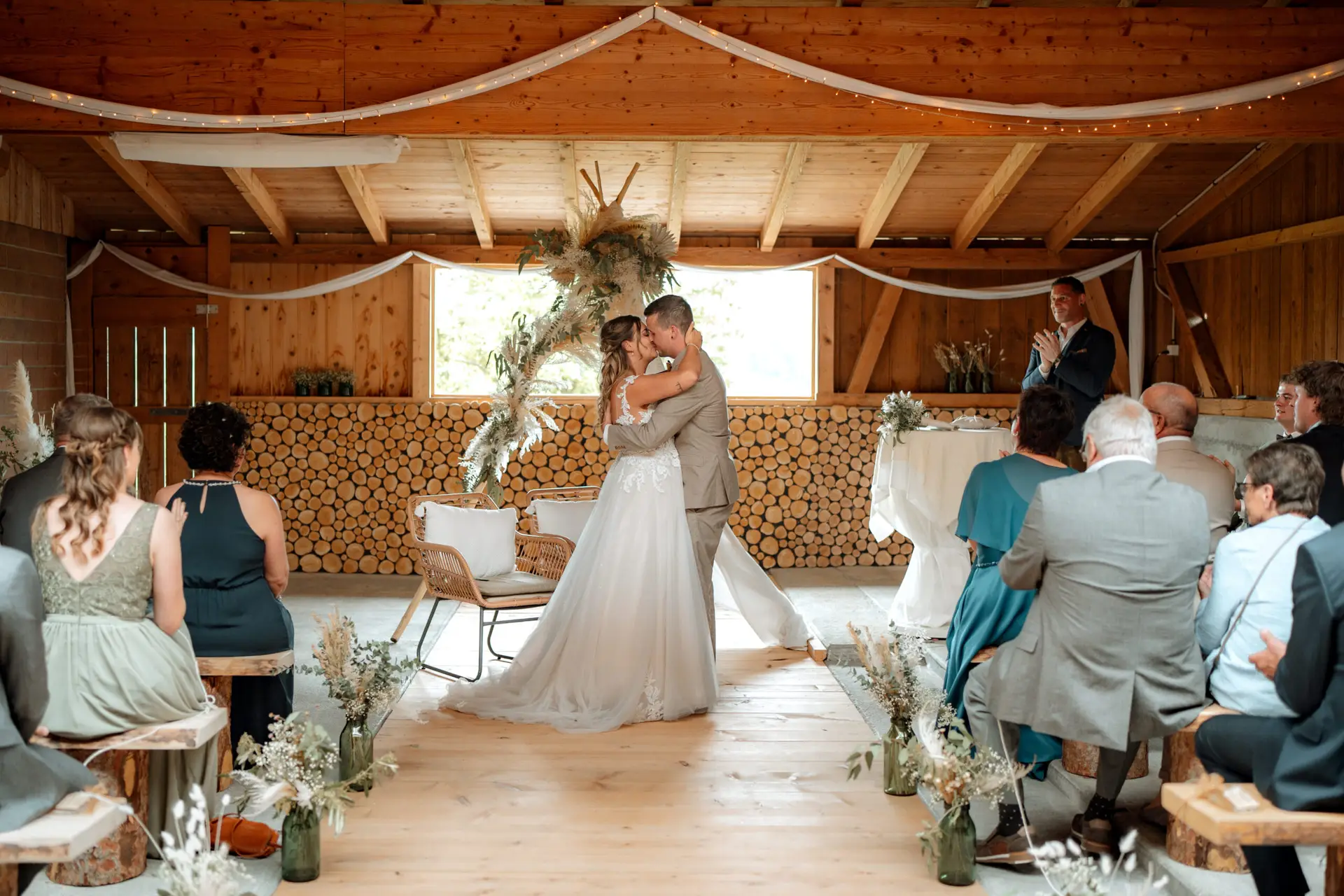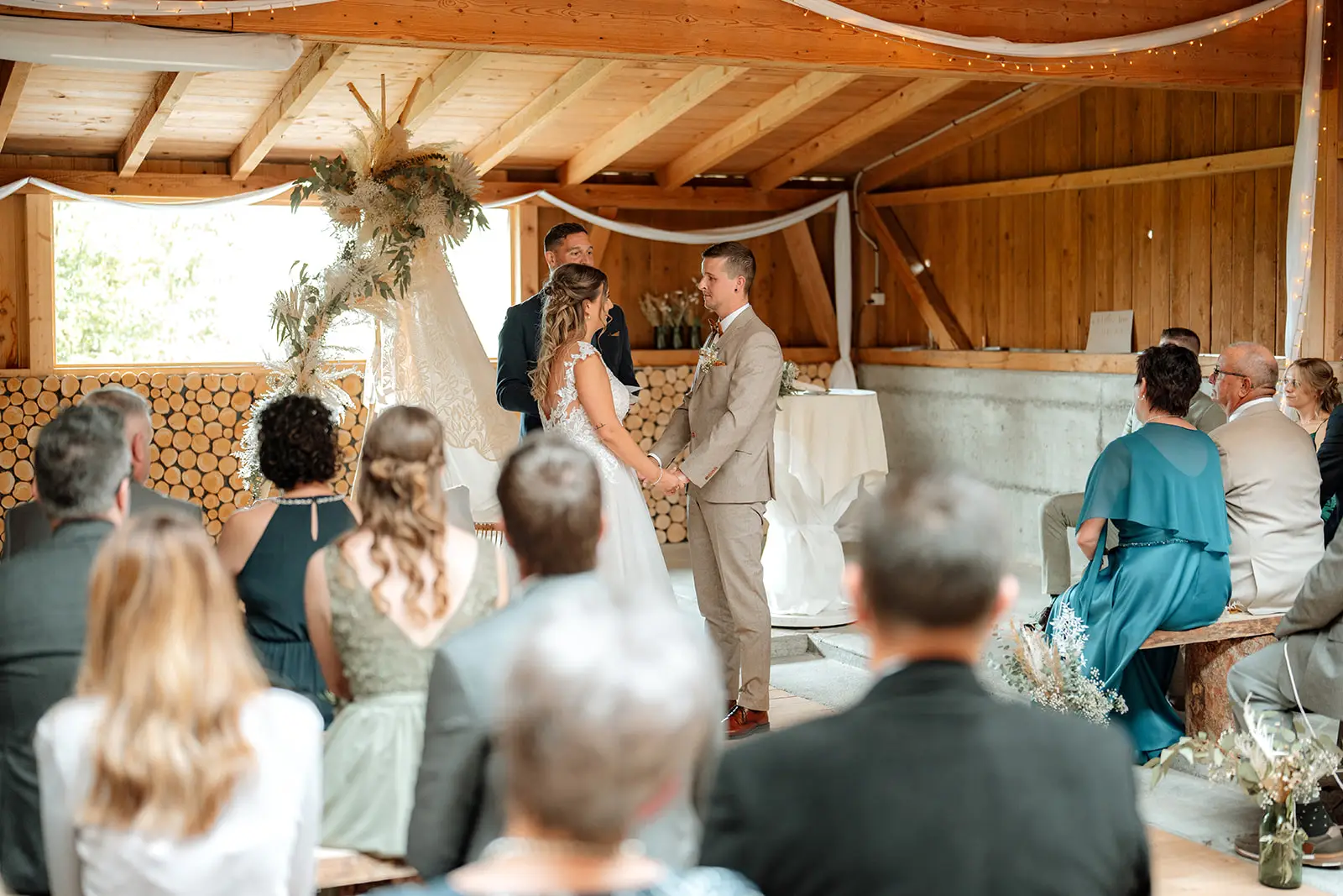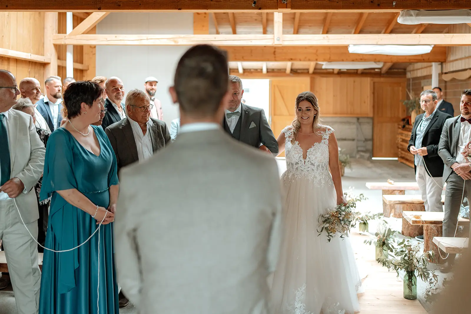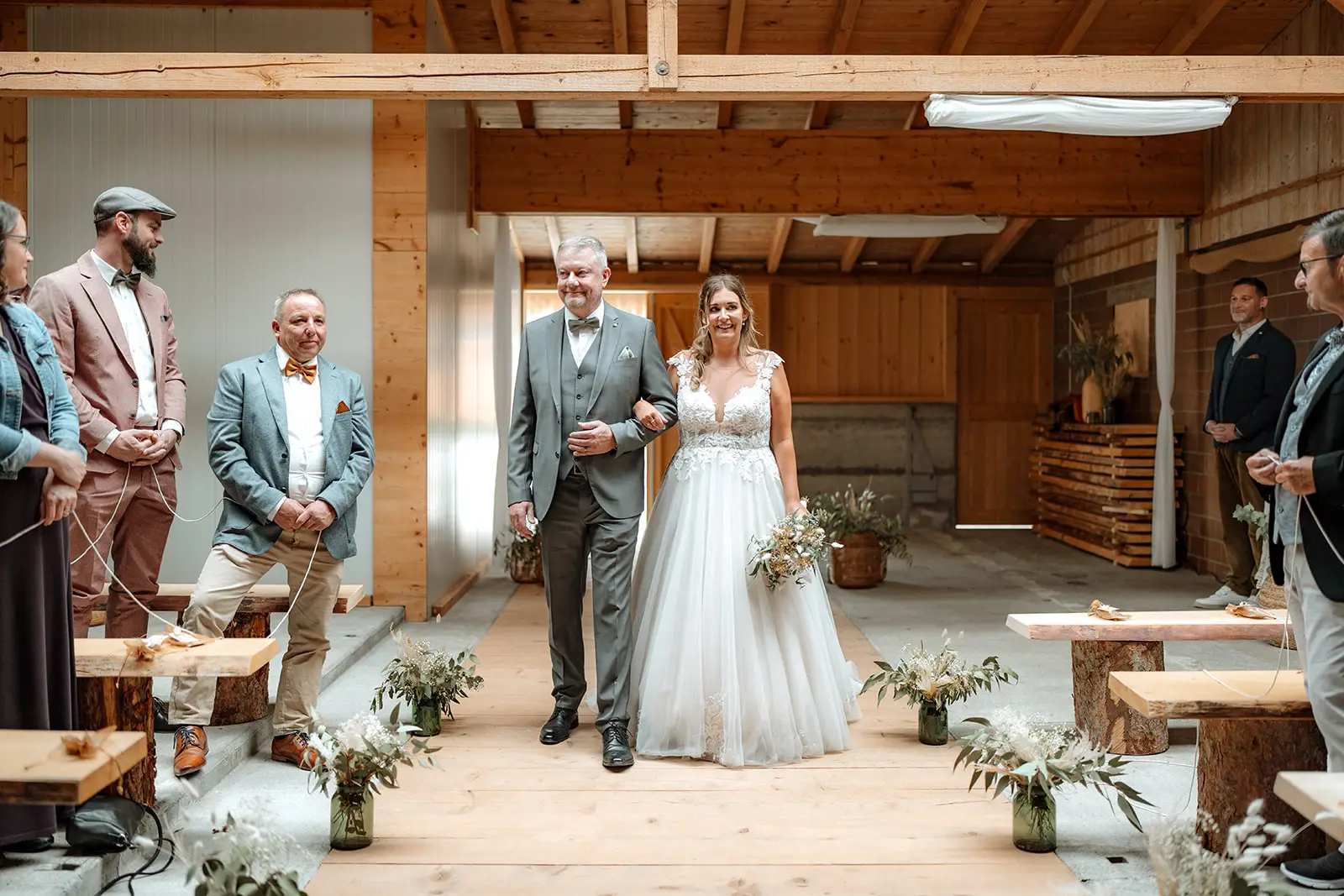 Die Trauung fand im Inneren der rustikalen Scheune der Birkenranch statt und wurde liebevoll von „dieIdee“ dekoriert. Holz, warme Farben, Lichter – es fühlte sich an, als würde man einen ganz eigenen kleinen Kosmos betreten. Michelle wurde von ihrem Vater zur Trauung geführt – ein Moment voller Zärtlichkeit, Stolz und genau jener Aufregung, die nur echte Emotionen auslösen können.