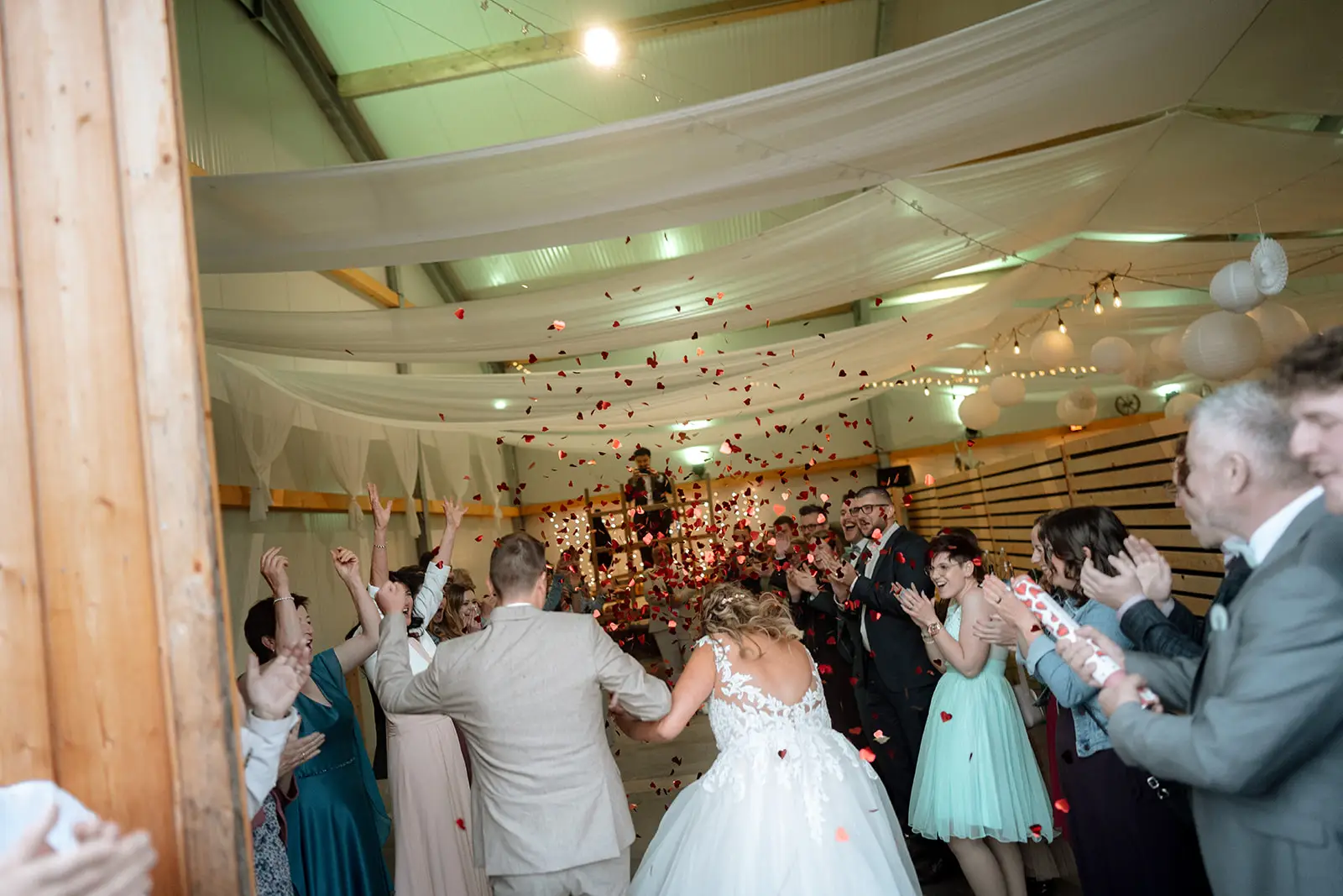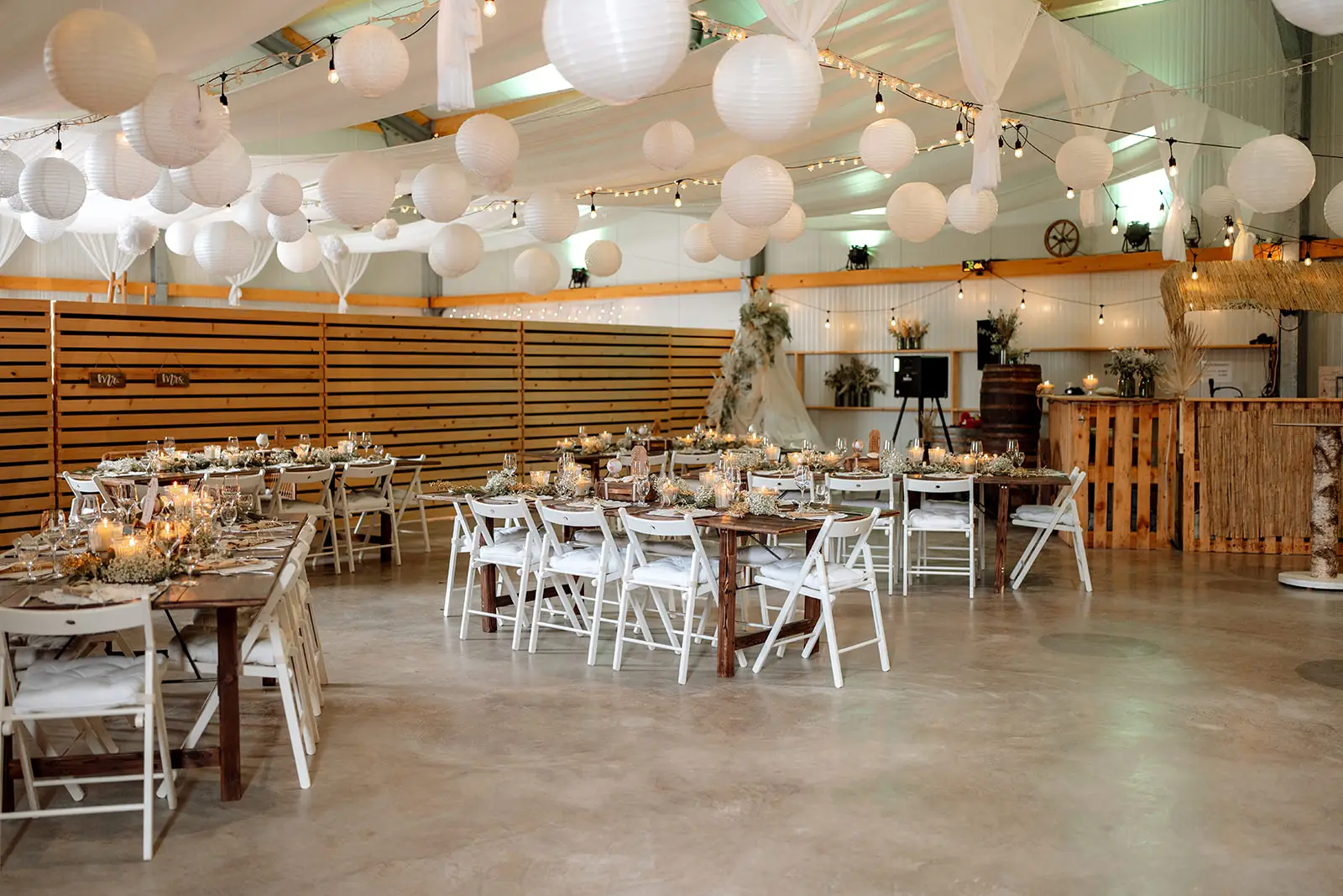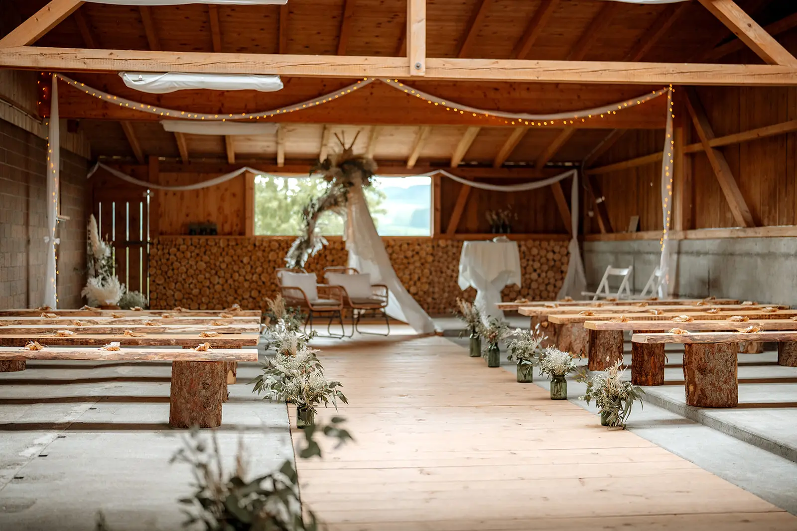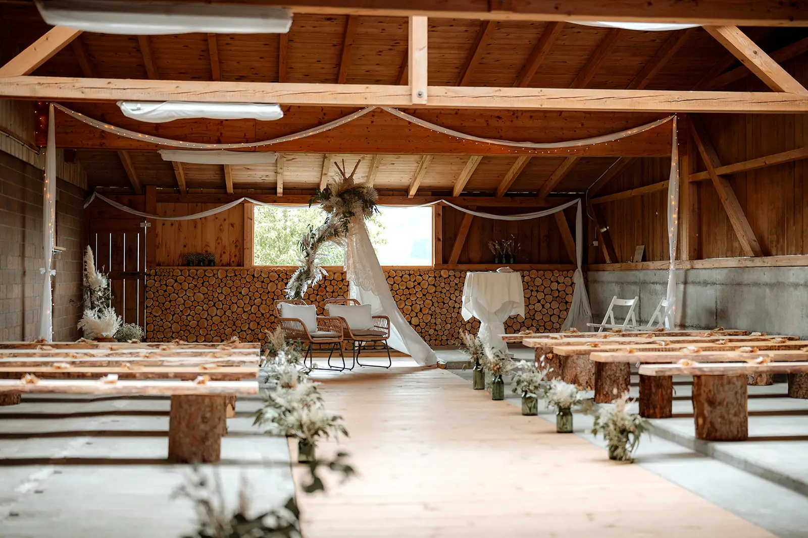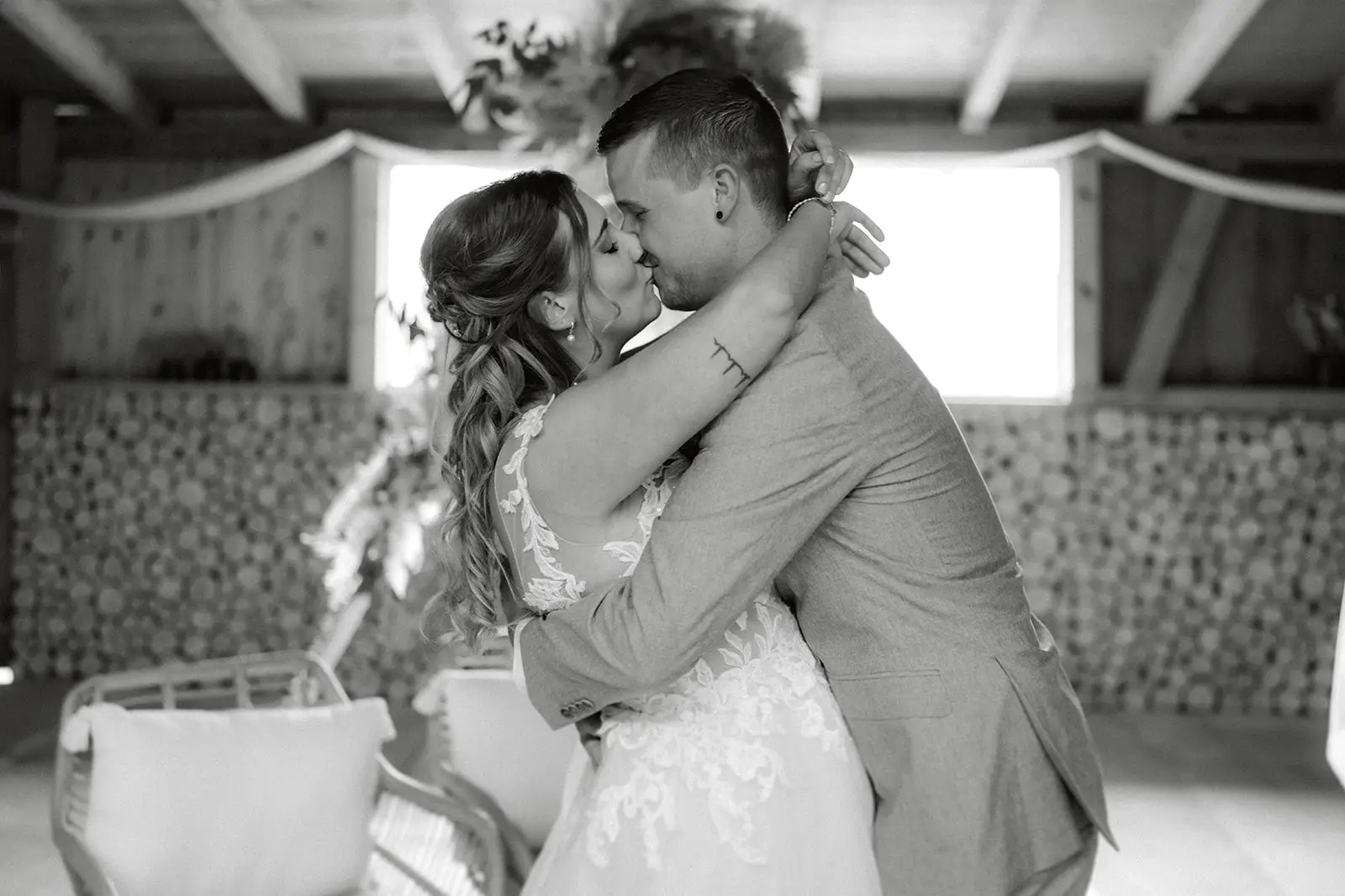 Die Trauung fand im Inneren der rustikalen Scheune der Birkenranch statt und wurde liebevoll von „dieIdee“ dekoriert. Holz, warme Farben, Lichter – es fühlte sich an, als würde man einen ganz eigenen kleinen Kosmos betreten. Michelle wurde von ihrem Vater zur Trauung geführt – ein Moment voller Zärtlichkeit, Stolz und genau jener Aufregung, die nur echte Emotionen auslösen können.