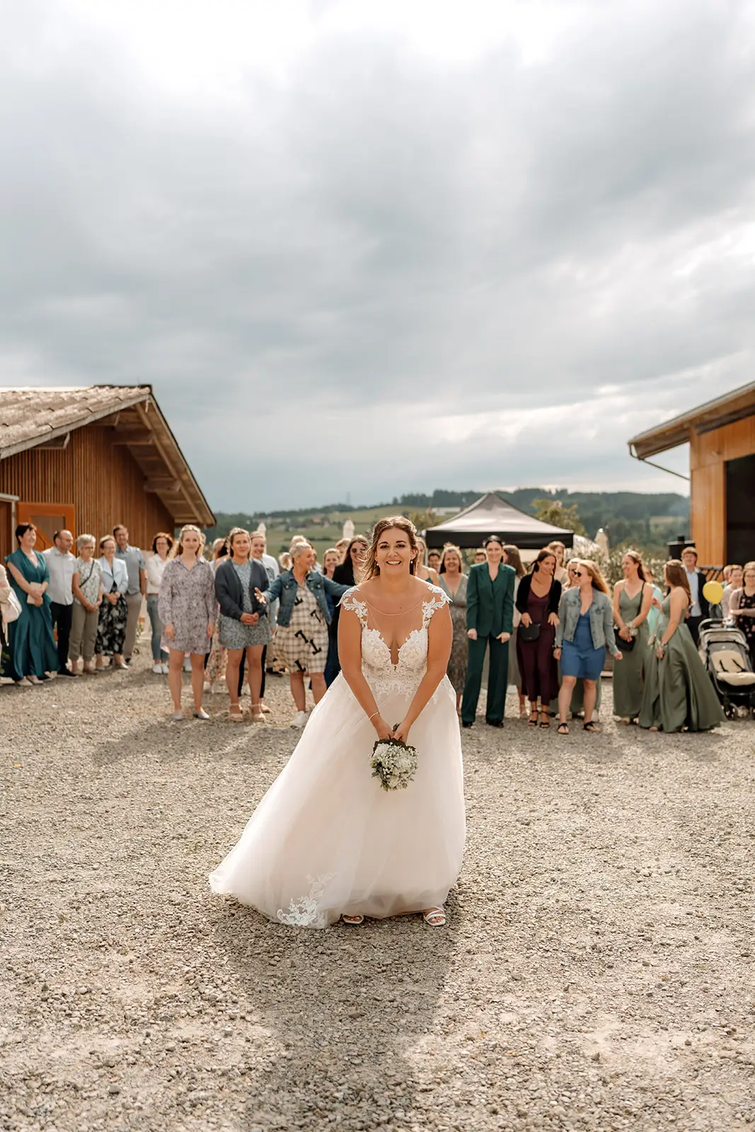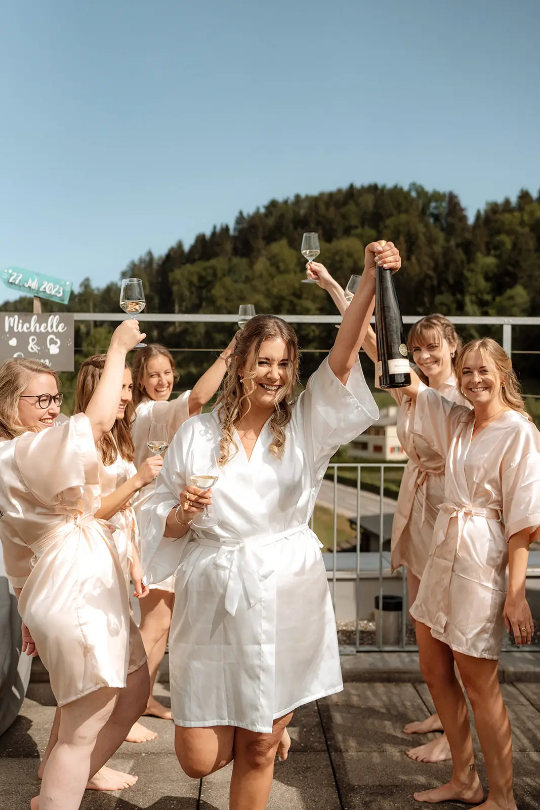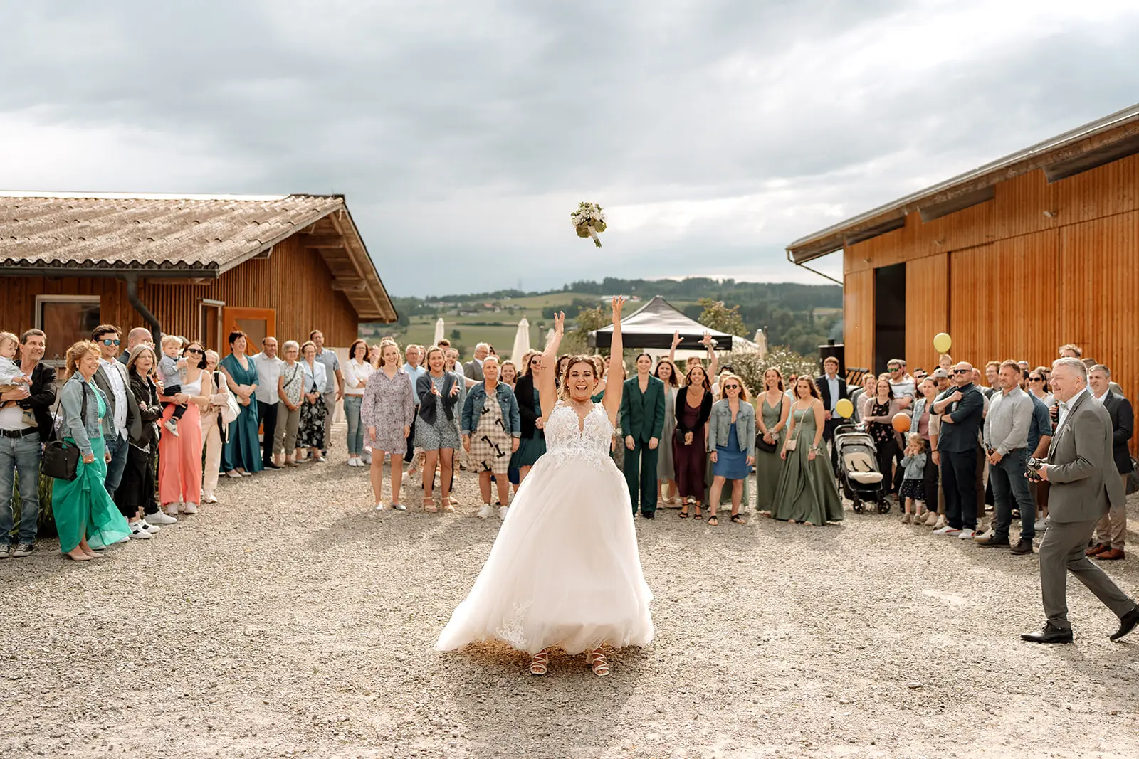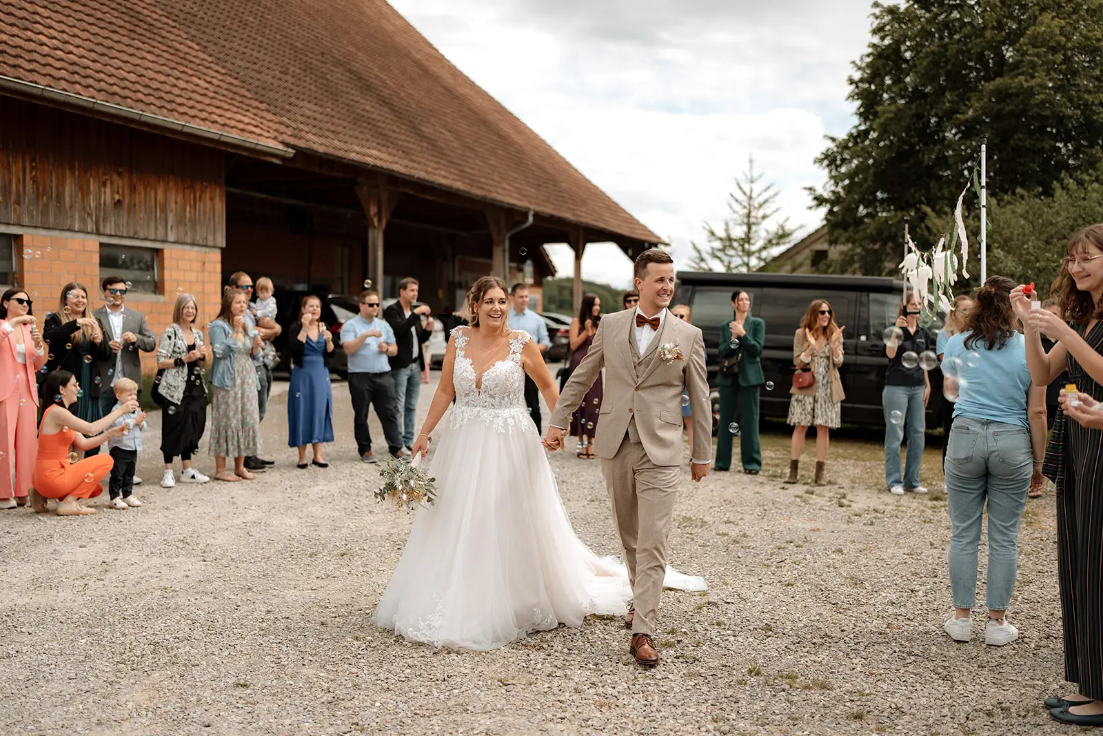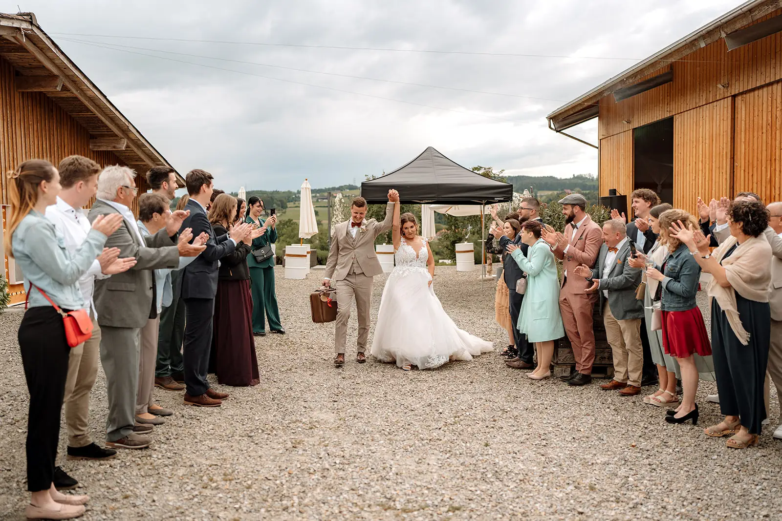 Nach dem Ja-Wort wurde draussen weiter gefeiert – Applaus, Umarmungen, Gratulationen. Die Stimmung war leicht, fröhlich und voller Energie. Und als am Abend die Musik lauter wurde und die Tanzfläche füllte, merkte man, wie frei und ausgelassen dieser Tag enden durfte: ein echtes Fest, genau so, wie es zu den beiden passt.