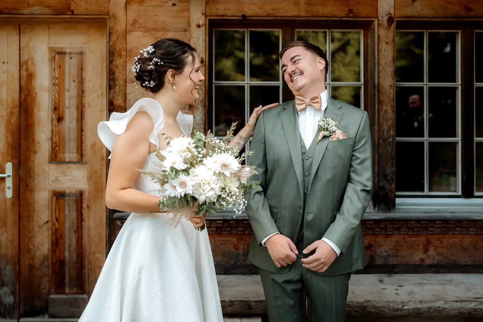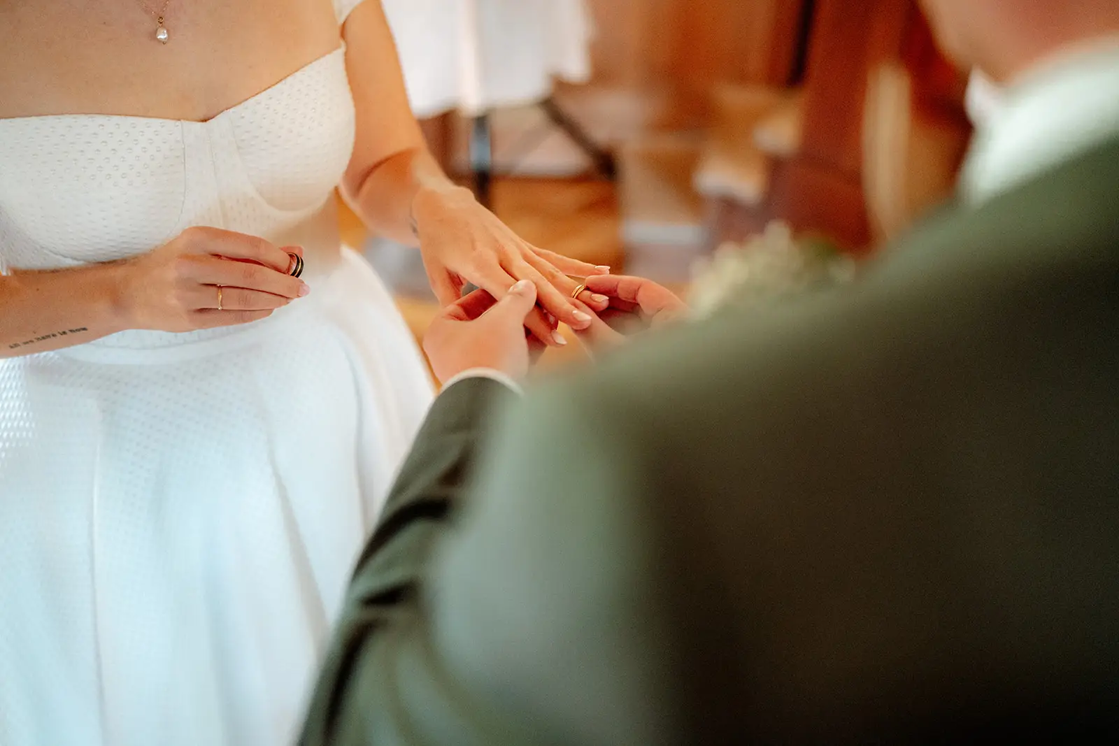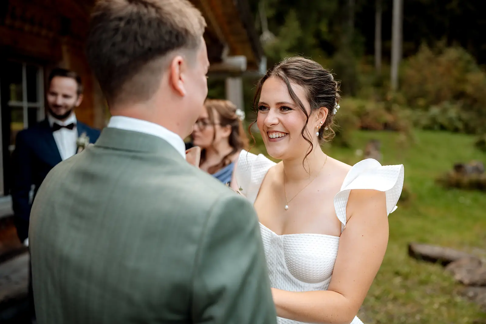 Der First Look fand ebenfalls in Reichenbach statt – im Wald, zwischen Moos, Licht und dem warmen Grün der Natur. Ein Ort, der genau das bot, was dieser Moment braucht: Ruhe, Verborgenheit, Nähe. Ein paar Schritte ins Tiefere, und plötzlich ist man ganz für sich – genau lange genug, um alles im Herzen ankommen zu lassen.