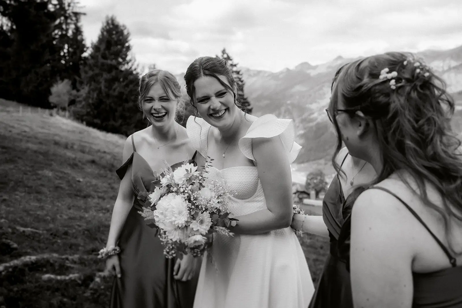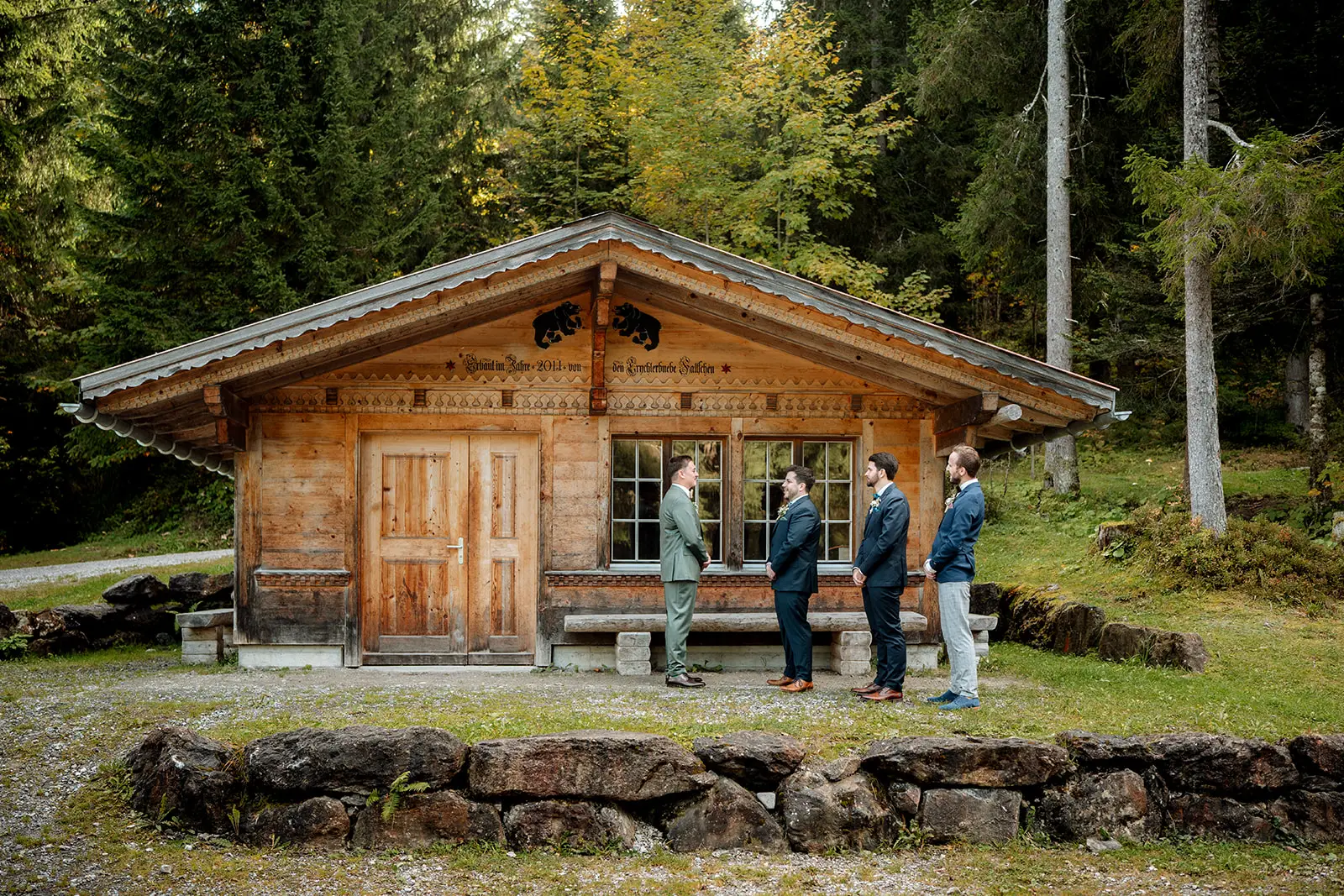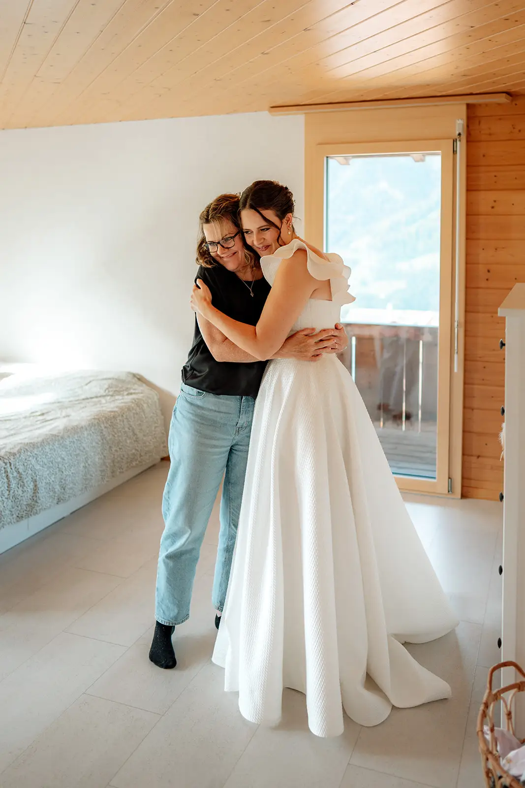 Der Tag begann in Reichenbach – ganz ruhig, intim und voller Vorfreude. Während sich die Braut zu Hause fürs grosse Fest bereit machte, füllte sich der Raum langsam mit dieser ganz besonderen Stimmung, die nur ein Hochzeitstag hat. Kleine Details, zarte Momente, liebevolle Blicke – alles noch im Stillen, bevor draussen die Berge den Tag eröffneten.