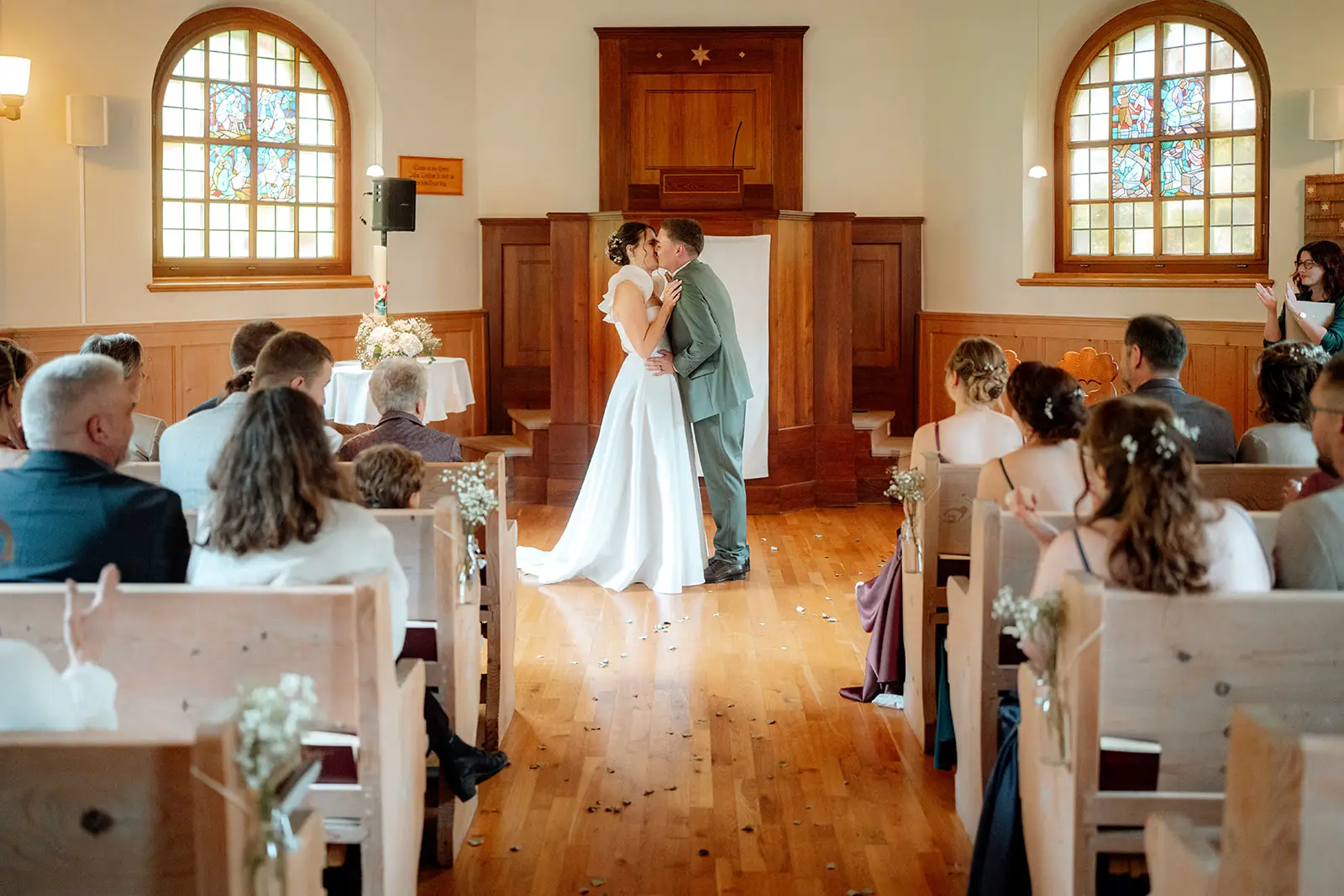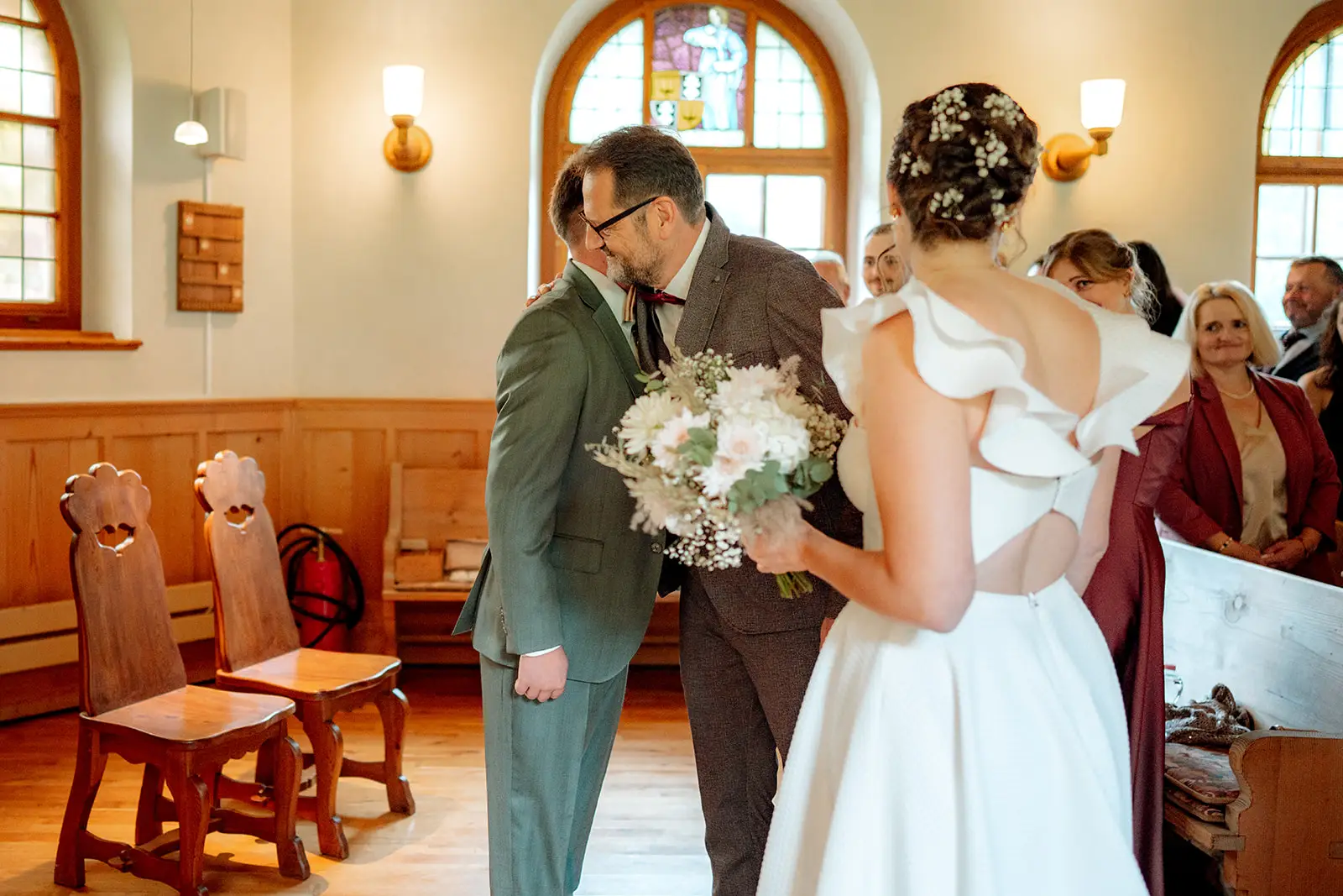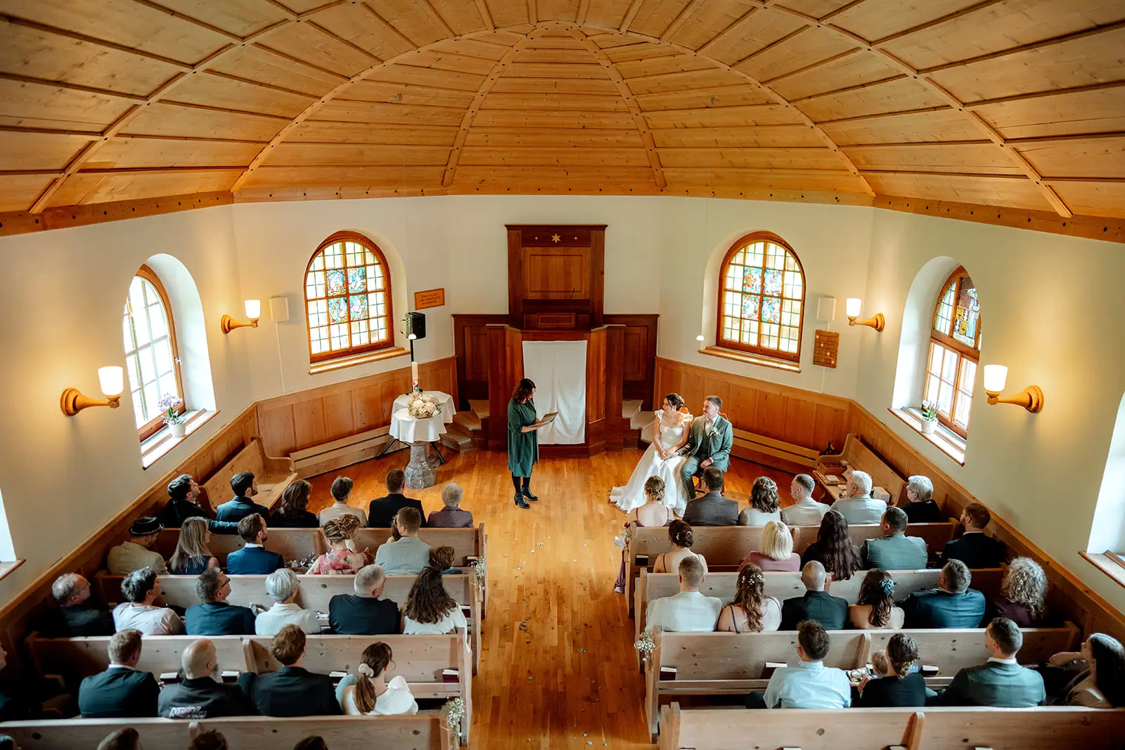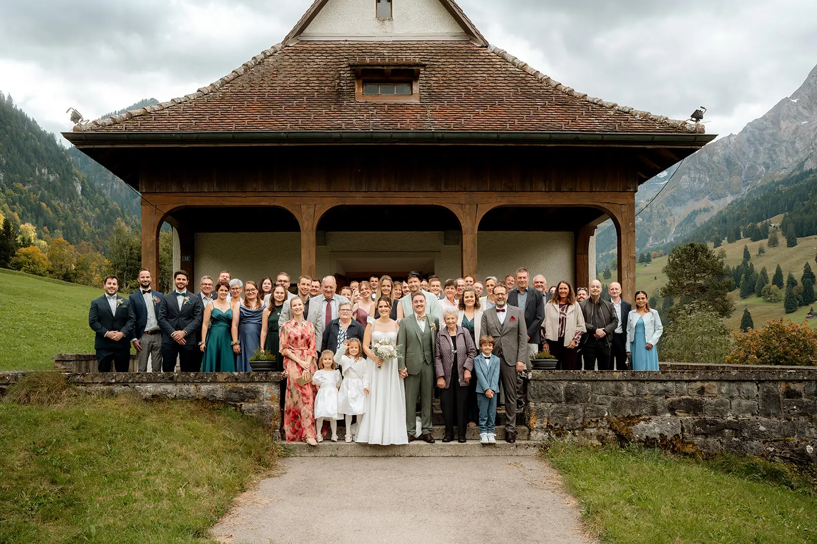 Die Trauung fand später in der Kapelle im Kiental statt. Holz, Licht, Berge vor der Tür – ein Ort, der die Geschichte der Region trägt und gleichzeitig so viel Wärme ausstrahlt. Worte, die berührten. Emotionen, die man in den Gesichtern lesen konnte. Und diese feine Mischung aus Festlichkeit und echter Natürlichkeit, wie man sie im Kiental einfach spürt.