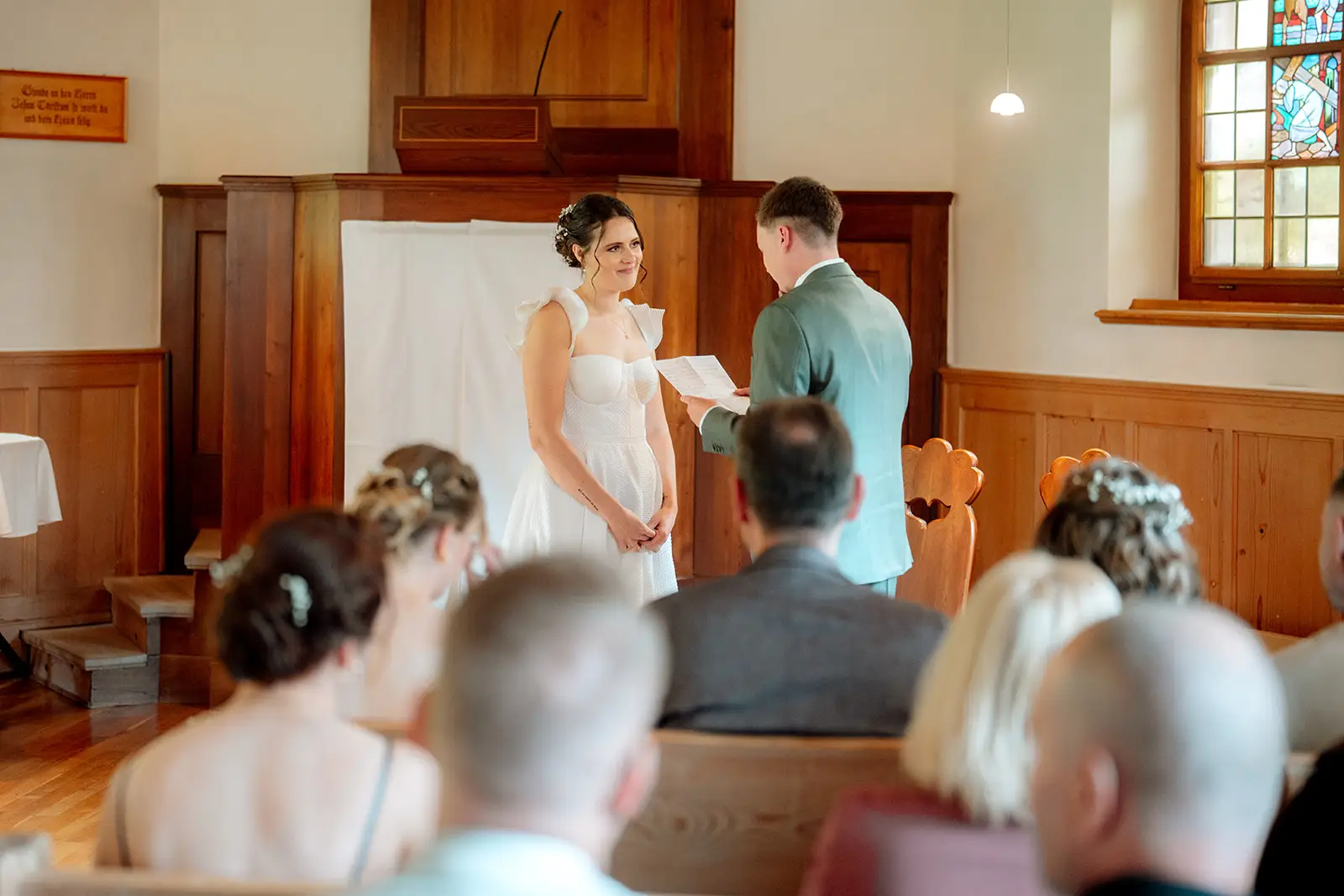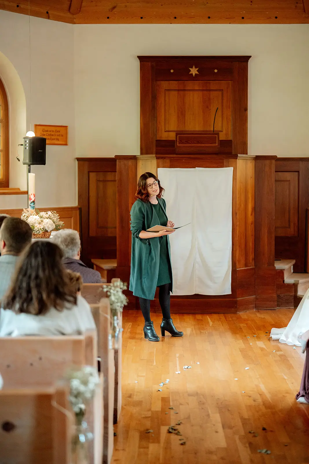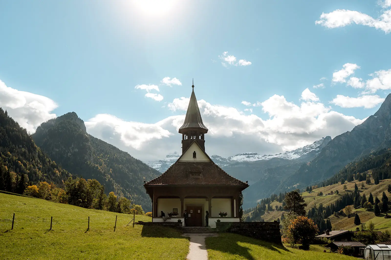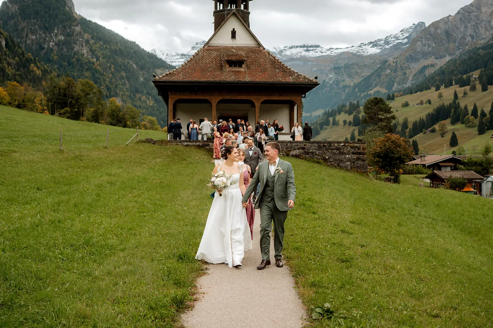 Die Trauung fand später in der Kapelle im Kiental statt. Holz, Licht, Berge vor der Tür – ein Ort, der die Geschichte der Region trägt und gleichzeitig so viel Wärme ausstrahlt. Worte, die berührten. Emotionen, die man in den Gesichtern lesen konnte. Und diese feine Mischung aus Festlichkeit und echter Natürlichkeit, wie man sie im Kiental einfach spürt.