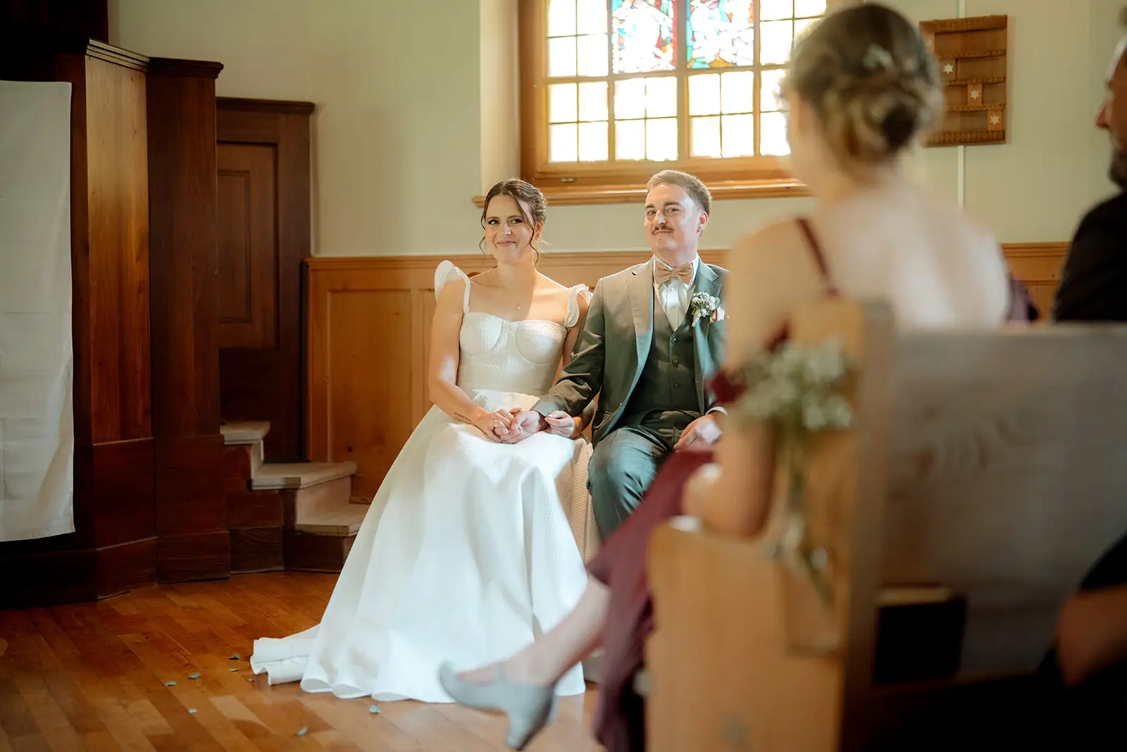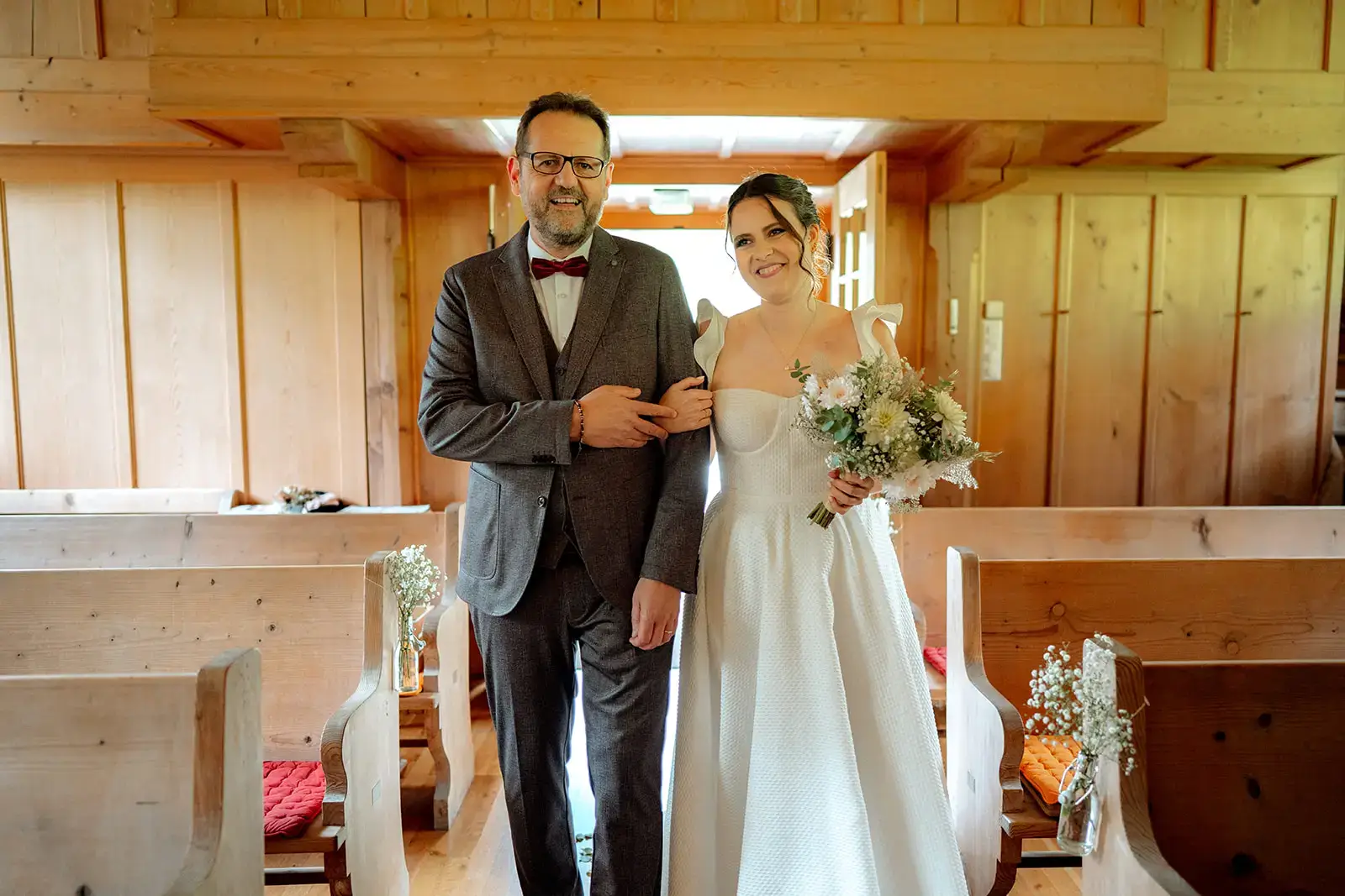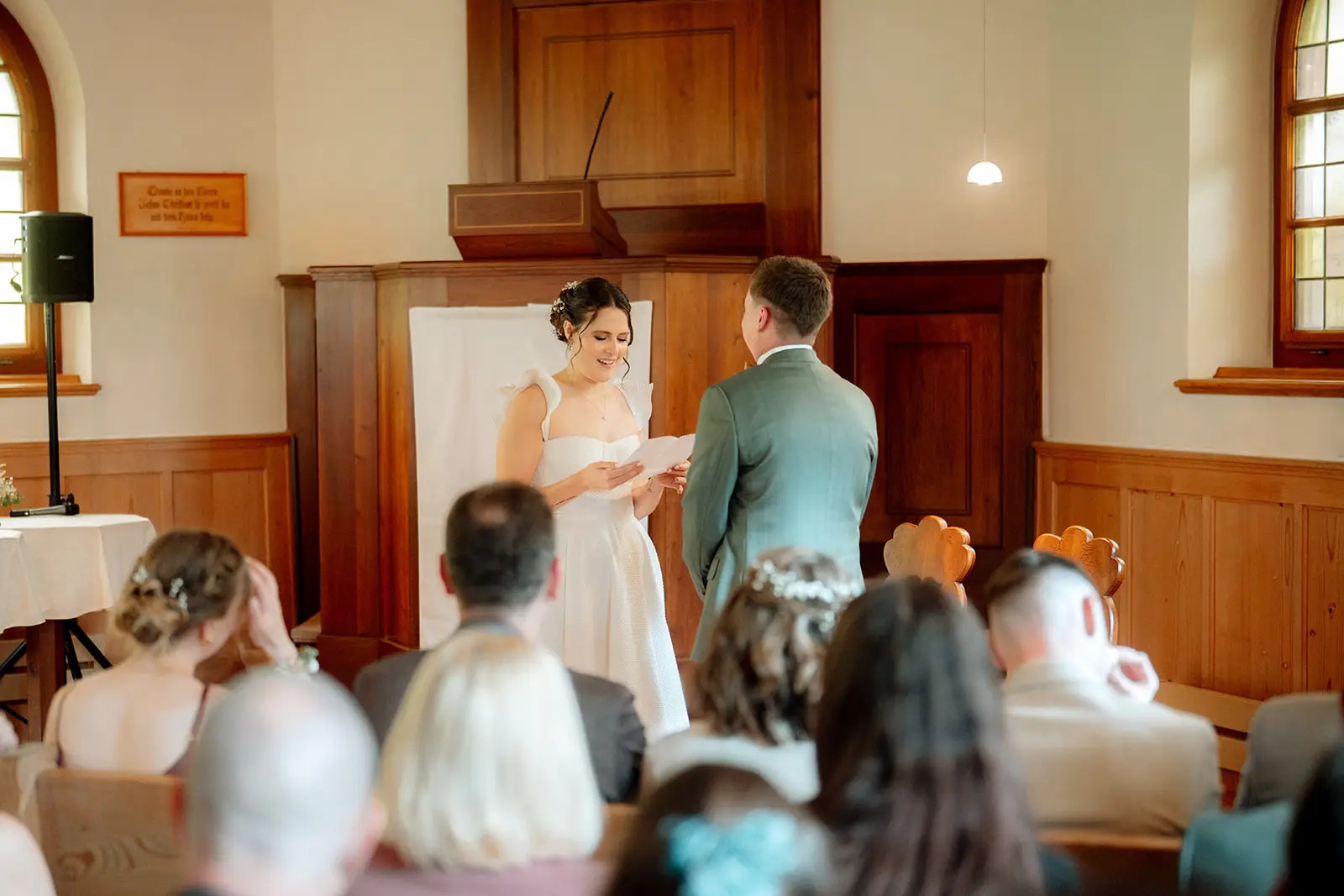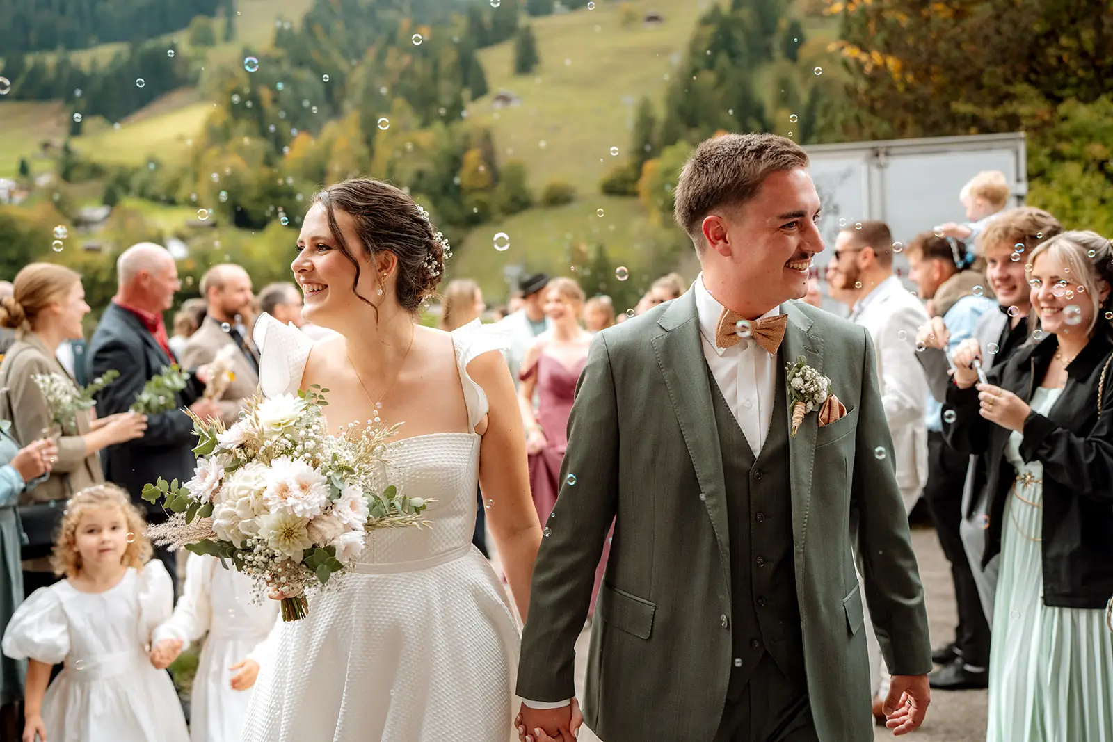 Die Trauung fand später in der Kapelle im Kiental statt. Holz, Licht, Berge vor der Tür – ein Ort, der die Geschichte der Region trägt und gleichzeitig so viel Wärme ausstrahlt. Worte, die berührten. Emotionen, die man in den Gesichtern lesen konnte. Und diese feine Mischung aus Festlichkeit und echter Natürlichkeit, wie man sie im Kiental einfach spürt.
