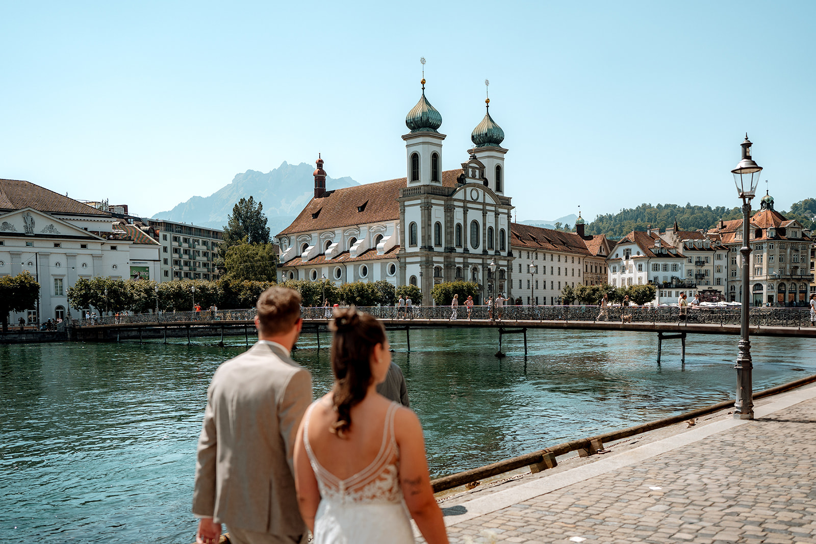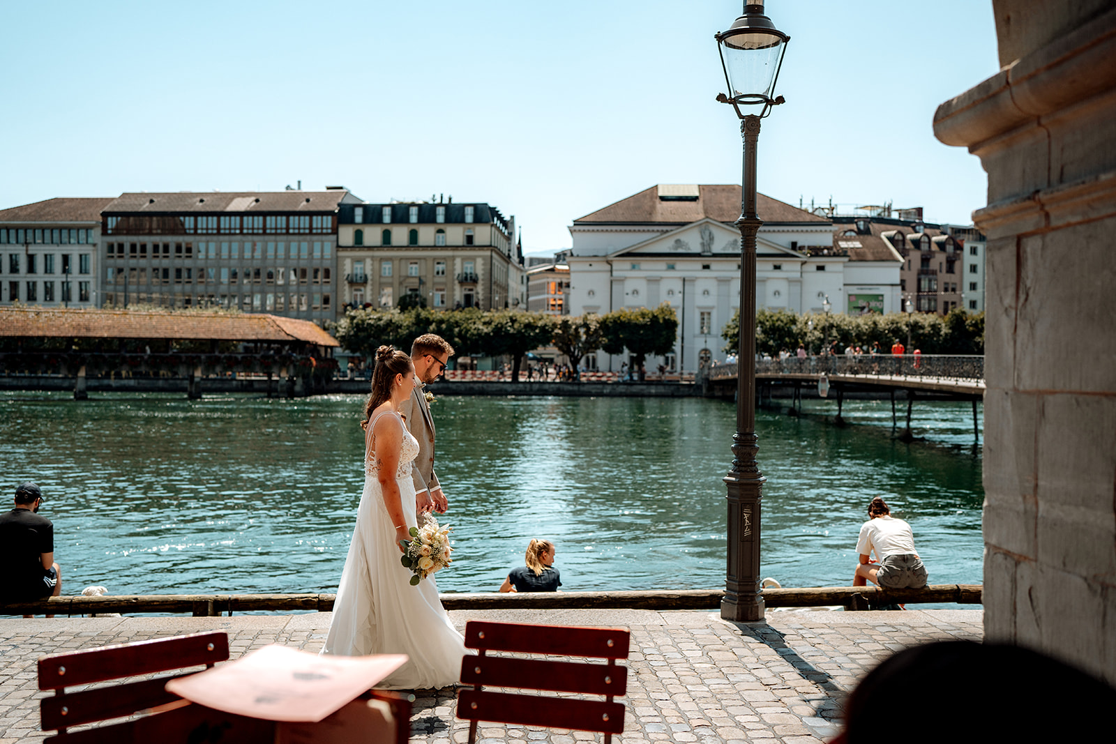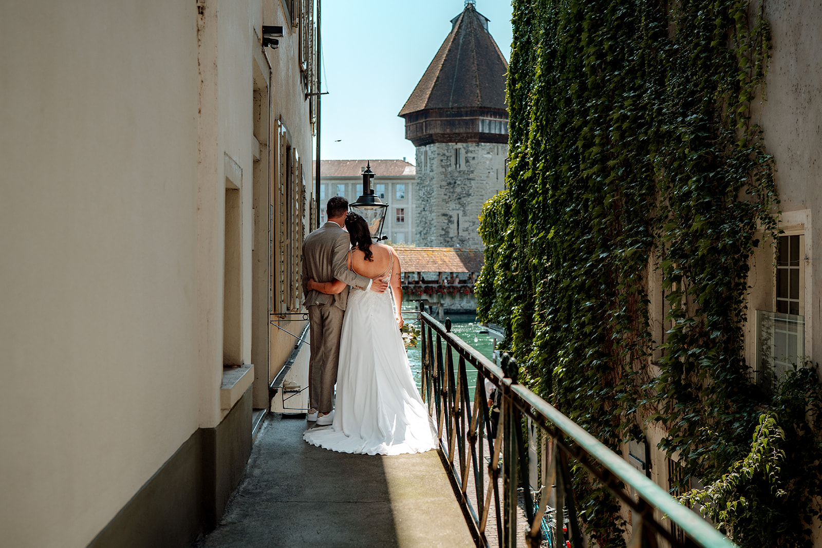 Nach der Trauung nutzten wir die wunderschöne Altstadt von Luzern für ein entspanntes Fotoshooting. Zwischen Kapellbrücke, Reussufer, kleinen Gassen und historischen Fassaden entstanden natürliche Hochzeitsfotos mit urbanem Charme. Die sommerliche Stimmung, das warme Licht und das lebendige Treiben der Stadt verliehen den Bildern eine ganz besondere Leichtigkeit.